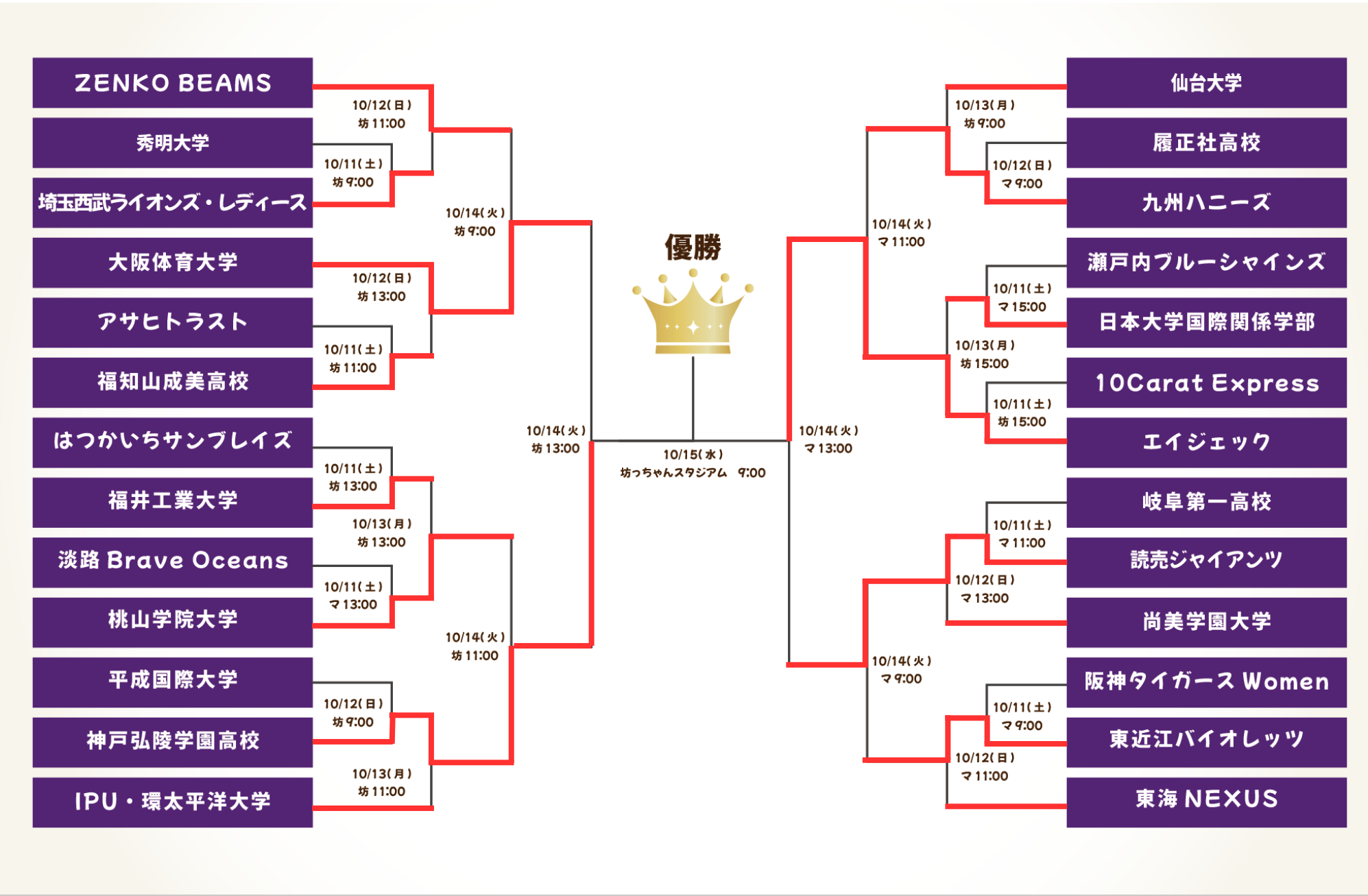 10月14日(火) 4日目 | 9:00 | T | 読売ジャイアンツ | VS | 東近江バイオレッツ | 試合詳細 | ![]() |