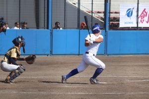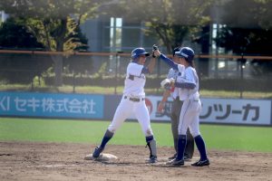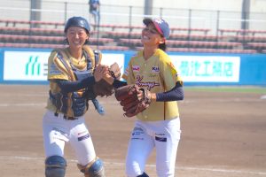 延長タイブレーク(無死一、二塁から再開)では、相手の犠打を一塁手の内藤が素早く処理して併殺を完成させるなどして3番手の竹村理が無失点で抑えると、その裏に島田羽菜が打席へ。このチャンスで「初球から狙っていました」との言葉通り初球を振り抜いて打球は左中間に落ち、サヨナラ。