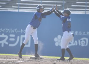 この回先頭の出口美有、矢島莉々果が連打でチャンスを作ると、福田稟のタイムリーで1点を返し、この間に矢島が一気に三塁を陥れる。さらに福田が二盗を決め、無死二、三塁とチャンスを拡大。すると山本詠が2点タイムリーを放ち、3対2と逆転に成功する。