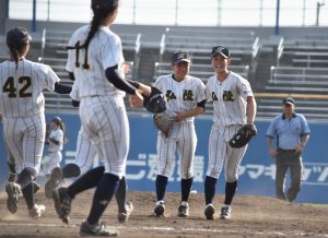 先手を取ったのは大体大だった。2回、木村睦実、荒川莉子のヒットで2死、一、二塁とすると、小塩かこがタイムリーを放って先制する。